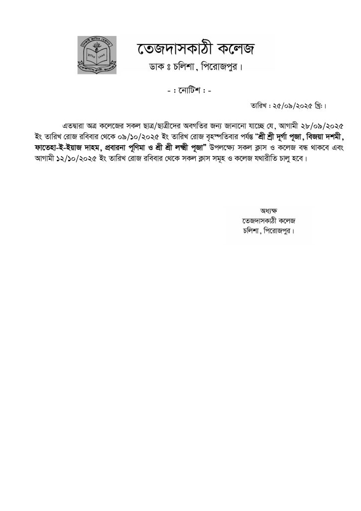 শ্রী শ্রী দুর্গাপূজা, বিজয়া দশমী, ফাতেহা-ই-ইয়াজ দাহম, প্রবারণা পূর্ণিমা ও শ্রী শ্রী লক্ষ্মীপূজা উপলক্ষে প্রতিষ্ঠানের সকল কার্যক্রম বন্ধ থাকা সংক্রান্ত নোটিশ।